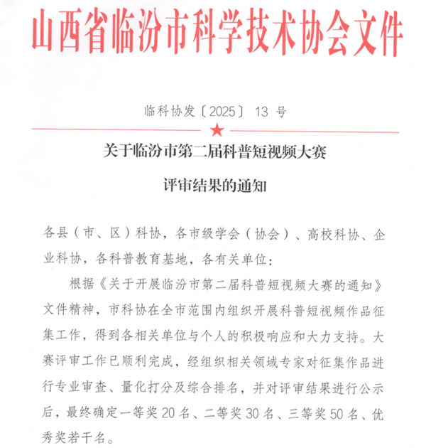 近日,临汾市科协组织开展临汾市第二届科普视频大赛,面向全市范围科技工作者、高校师生、中小学青少年、科普爱好者征集科普作品。经过组织相关领域专家审核、评审、公示等环节,评选出获奖作品。