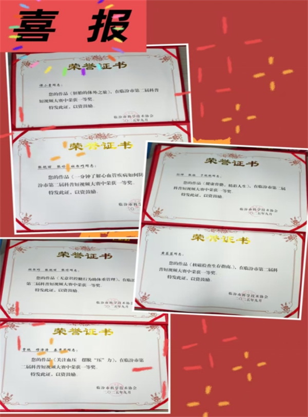临汾市人民医院多个科普视频作品以专业的角度、脱俗易懂的形式荣获一等奖6项,二等奖13项,三等奖19项,多项优秀奖。